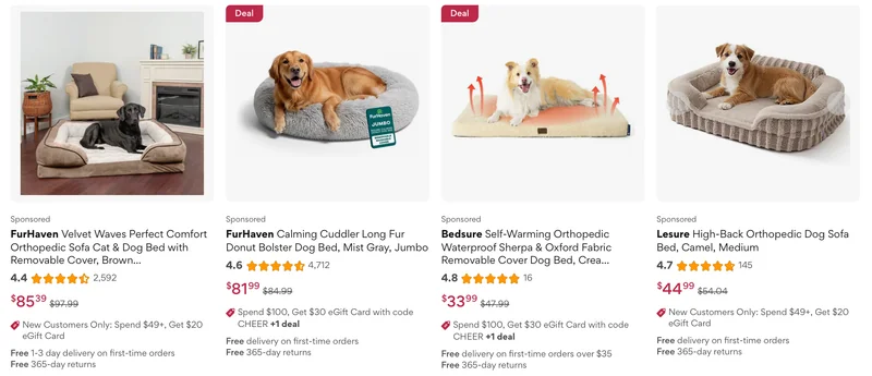 Memory foam beds, joint chews, red light therapy pads.